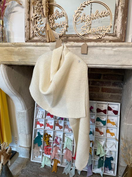 Splendide étole pour embellir votre tenue et vous tenir chaud lors du grand jour. Son élasticité naturelle vous permettront de la porter de différentes façons. C'est sans aucun doute l'indispensable accessoire, celui qui se dépose sur votre silhouette. Sa teinte ivoire claire  s’accorde facilement avec la plupart des robes de mariées. Vous aurez l'occasion de la reporter en foulard, lors des jours frais d'hiver elle vous tiendra chaud et illuminera votre teint.